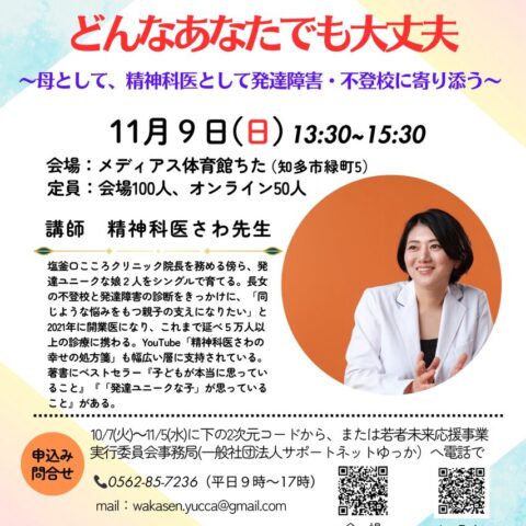 セミナー 【講演情報】知多市若者サポートセミナー2025 「どんなあなたでも大丈夫 ~母として、精神科医として発達障害・不登校に寄り添う~」(2025.11.9)